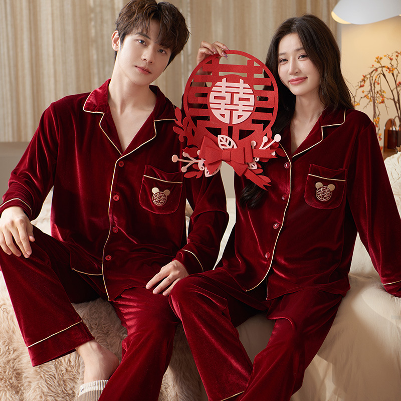 2025年結婚新婚カップル向けパジャマ 女性用ワインレッド 秋冬 ゴールドベルベット 軽贅沢 メンズ高級感パジャマ