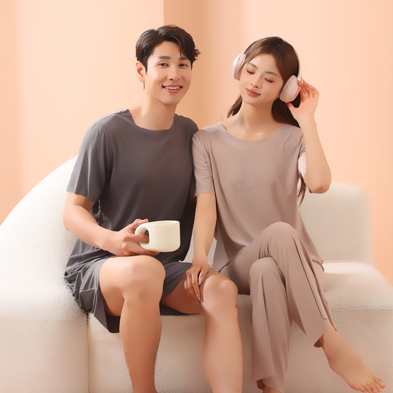 カップルスタイルルーズ夏アイスシルクパジャマセット若者カジュアルホーム無地ドレープクールスーツ男性と女性用