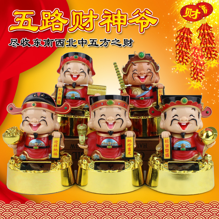 卸売りの小さいサイズの太陽エネルギーはうなずいて元宝の5路の財神のおじいさんのレジの招財の家は品物の贈り物を飾っています。