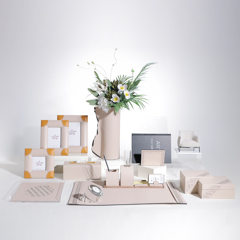 大星の新商品の超繊維の皮の米の黄色のテーブルは筆筒のティッシュの箱の本棚の収納の組み合わせの高級な置物を敷きます。