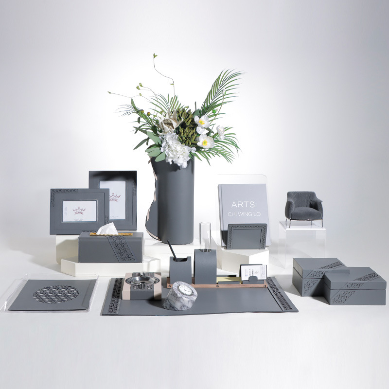 大星の家の灰色の超繊維の皮革のデスクトップの装飾はティッシュの箱の高級な筆筒のアクセサリーの収納箱の置物を収納します。