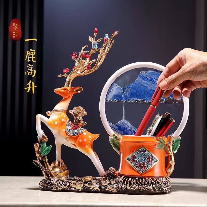 一鹿高昇筆筒収納置物家庭書斎事務室解凍砂時計流砂画装飾品プレゼント