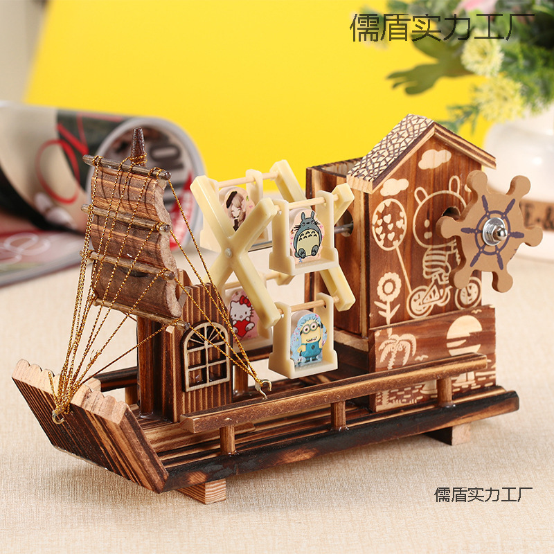 M1512 木製風車ヨット回転オルゴール 60-273 クリエイティブ木製ペンホルダー学生誕生日