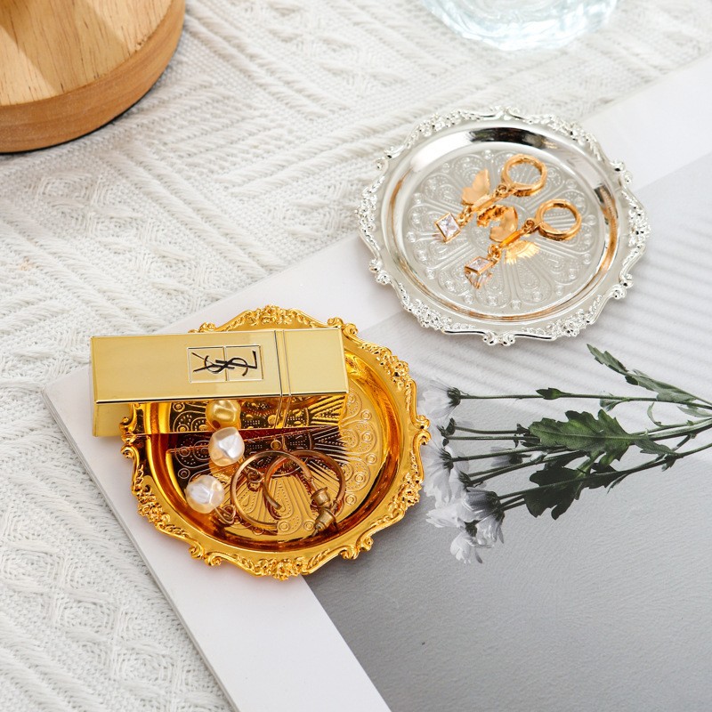 金属エンボスプレート小皿レトロアロマセラピーシルバー食器トレイジュエリー収納トレイデザートケーキプレート