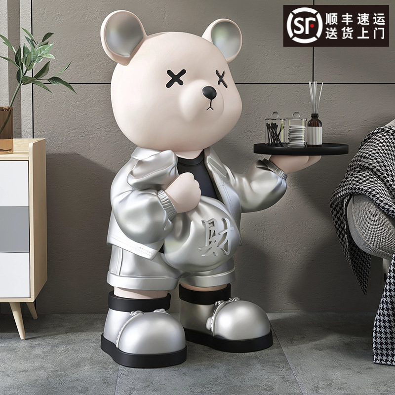 カートゥーン熊の大型着地祝い置物ホームアクセサリーリビングルームのお茶のそばのトレーに引っ越しプレゼントを収納します。