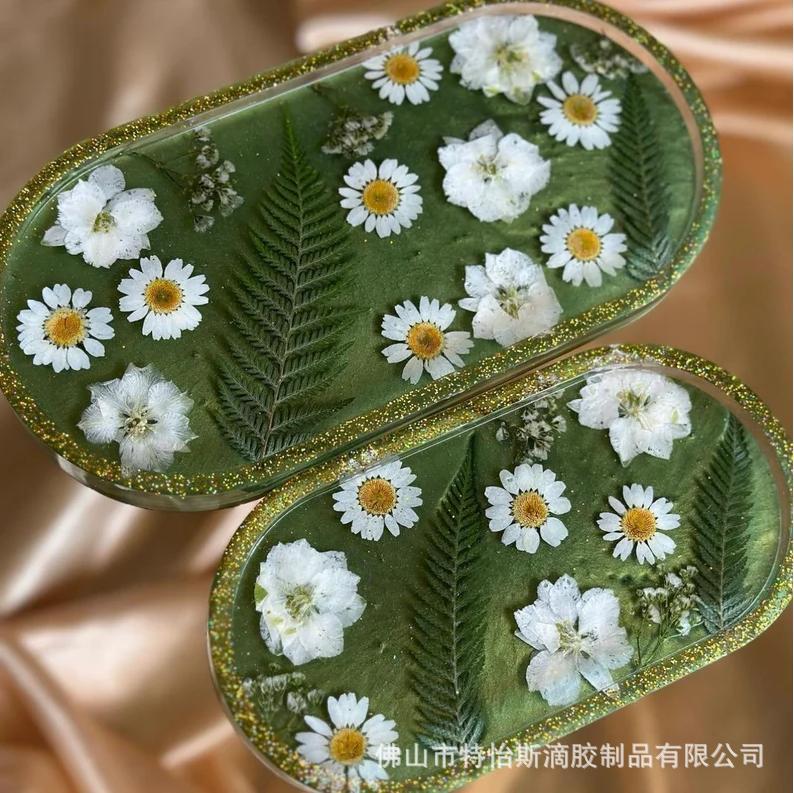 新品绿色珠光白雏菊飞燕真花滴胶托盘首饰收纳金边装饰绿叶小托盘
