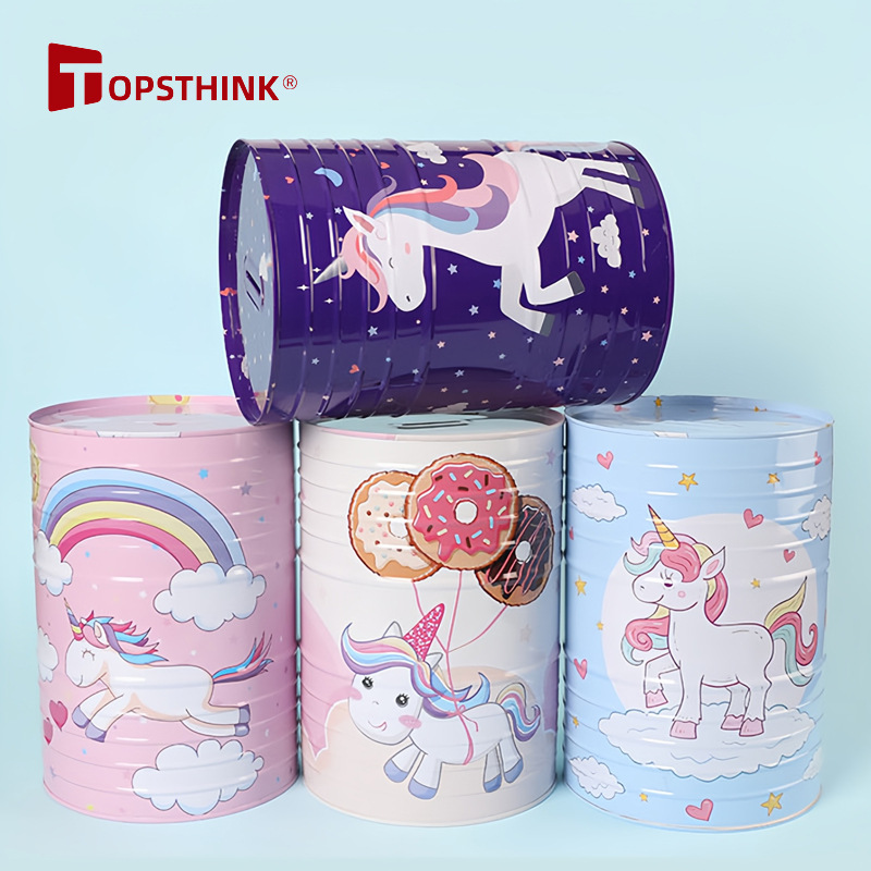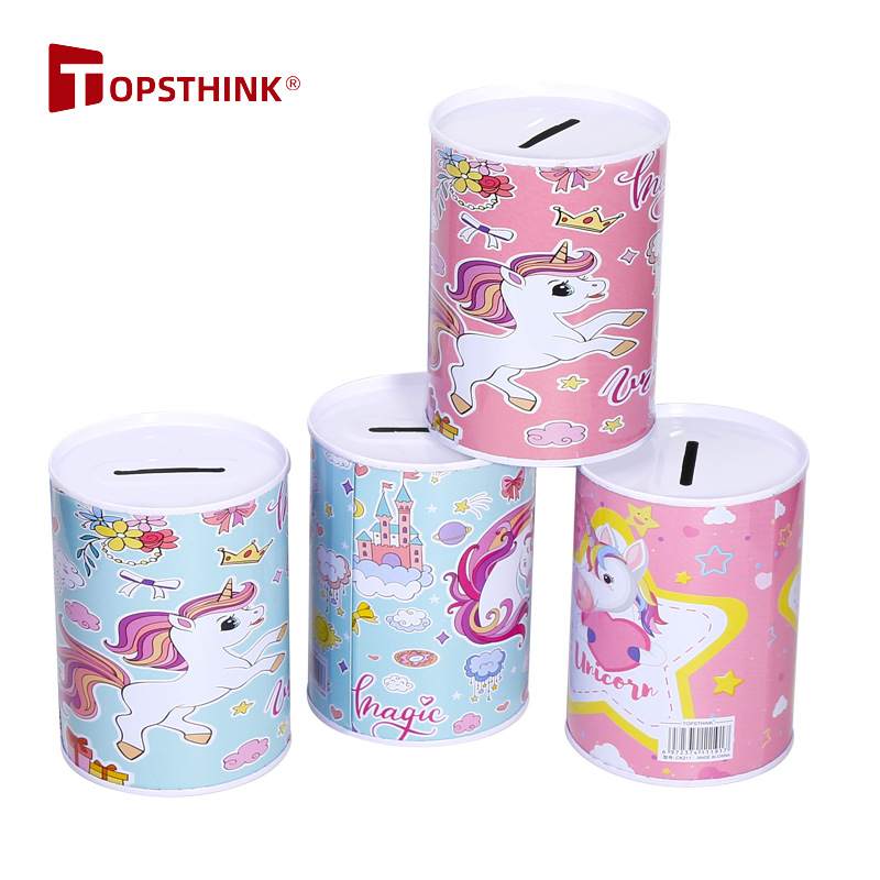 新しいアイデアのユニコーンの漫画の設計の円筒の漫画図は貯金箱のブリキの材質の小銭の缶を貯蓄します。