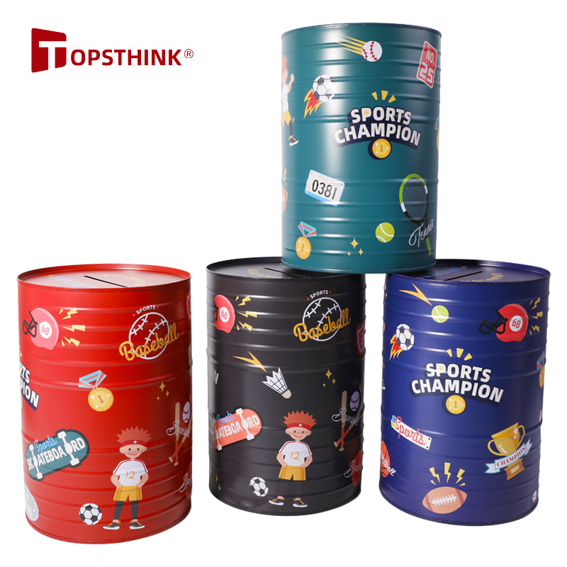 球技ブリキ貯金箱は大きいサイズの密封円筒小銭缶しか入れません。