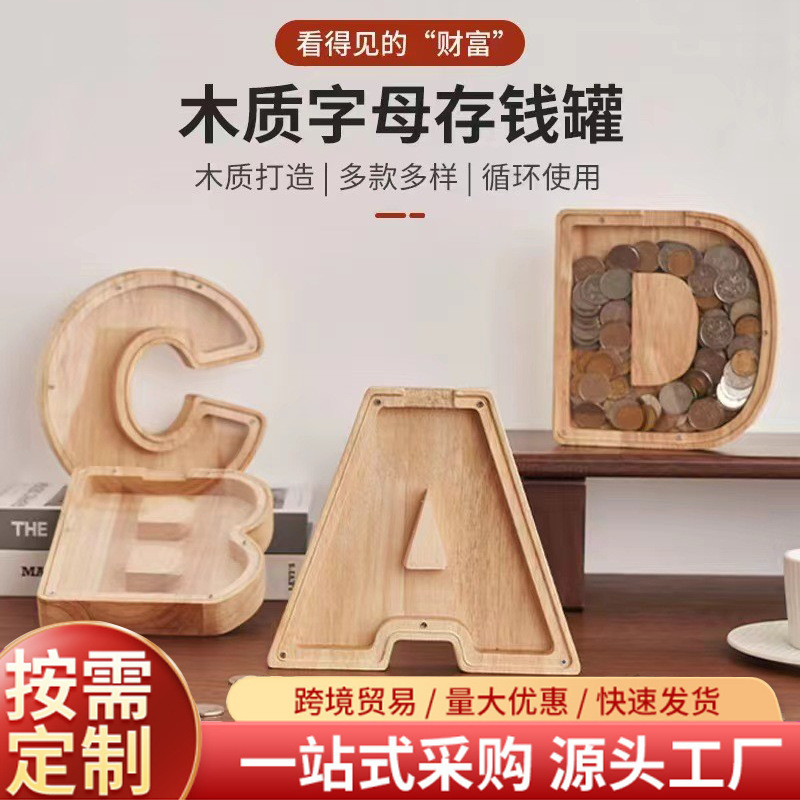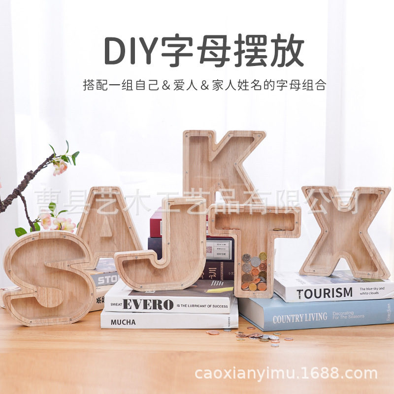 クロスボーダー木製アルファベット貯金箱木製貯金箱置物ins透明蓋コイン貯金箱