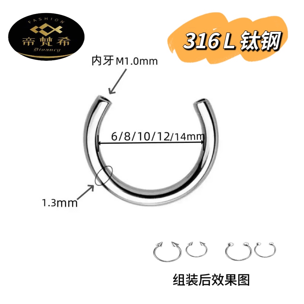越境新品ステンレス材質d型鼻環医療用f136チタン穿刺アクセサリー多鼻環鼻釘