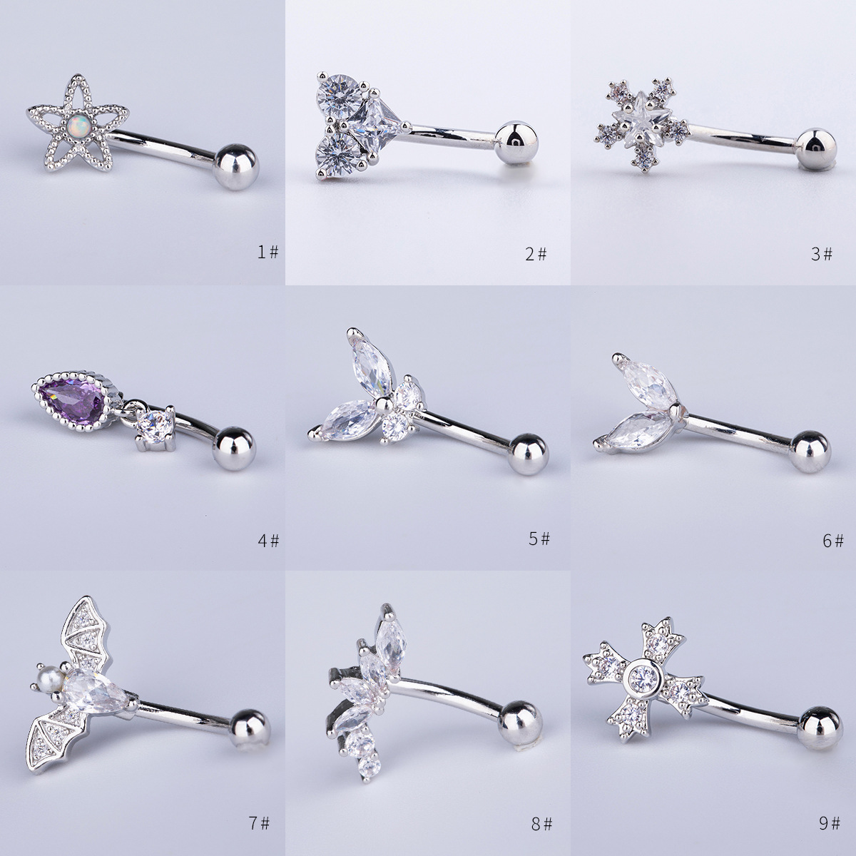 国境を越えたステンレス内歯ジルコン眉釘二頭五星/円形ジルコン曲柱眉環多色耳軟骨釘