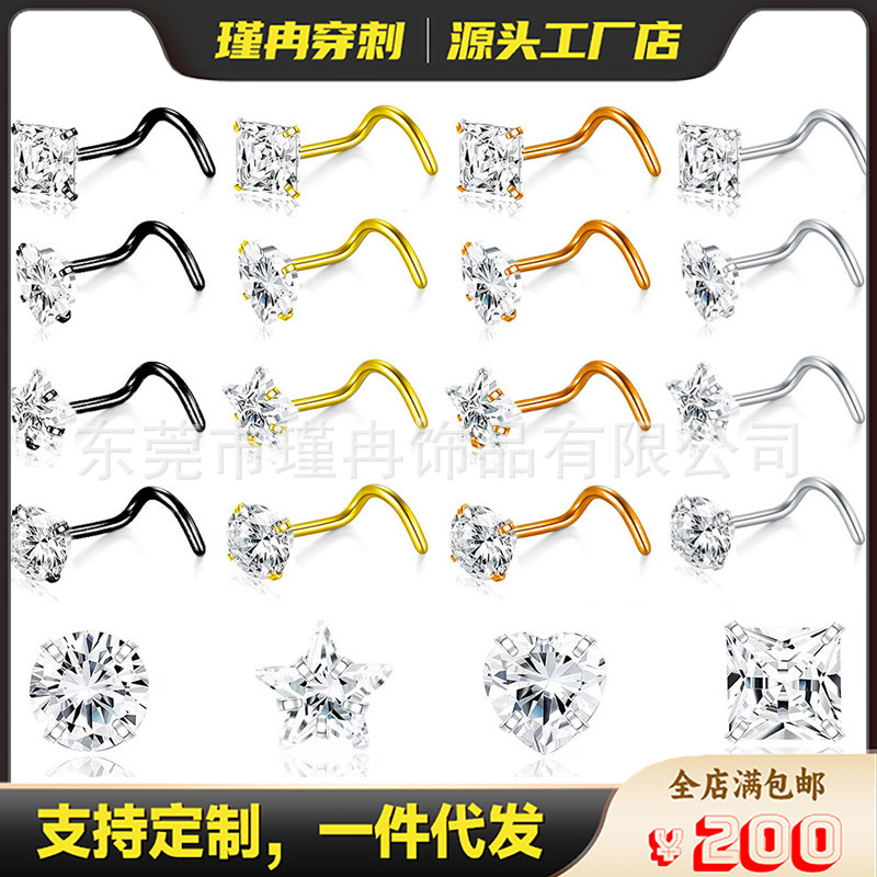 ステンレス四爪ジルコン鼻釘セット穿刺曲げ棒ハート型直棒鼻環人体穿刺鼻アクセサリー