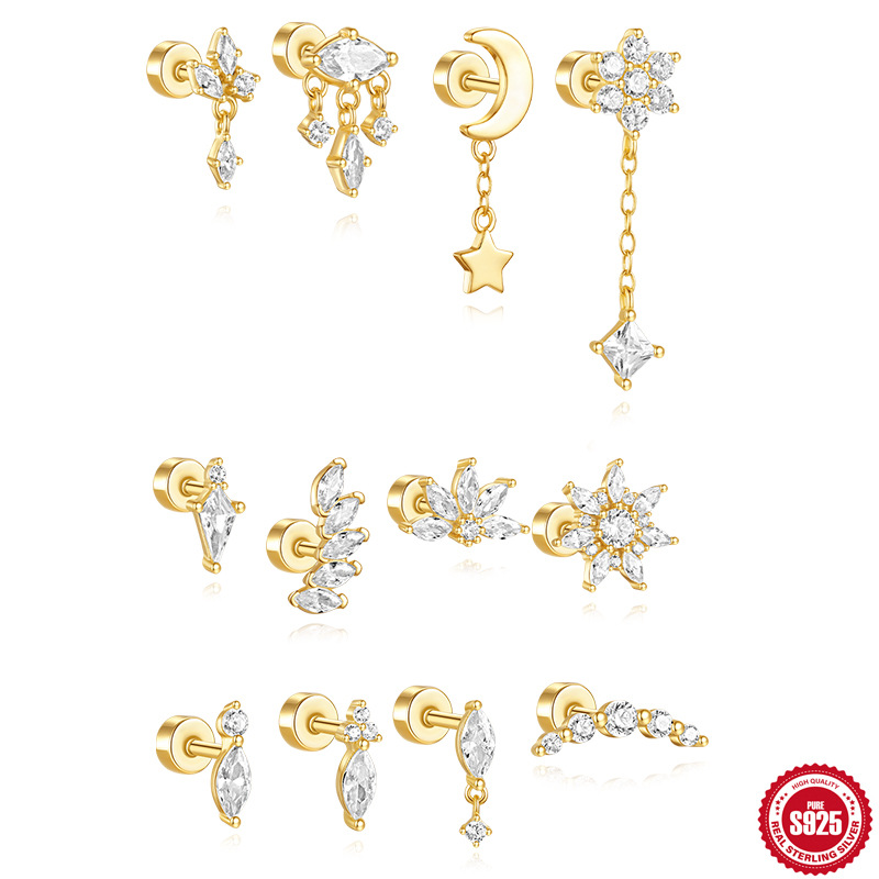 欧米ファッションs925純銀星月凧花光沢面流蘇平頭外ねじ穿刺耳骨釘