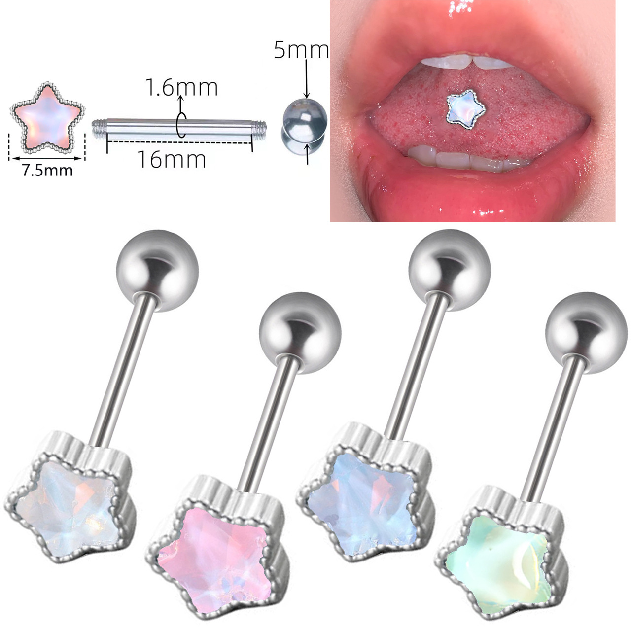 国境を越えた電子商取引の新しい五芒星オーロラ舌ネイルシンフォニーグラデーションキャンディーカラーのステンレス鋼の穴あき舌ネイル舌リング