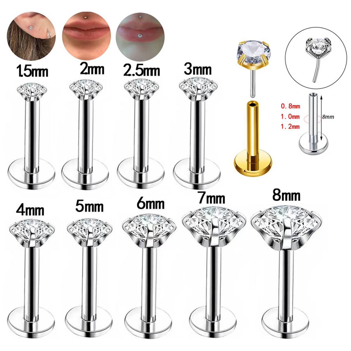 ジルコン耳釘骨釘包辺内ねじ平唇釘医療用チタン鋼16g線径DIY穿刺アクセサリー