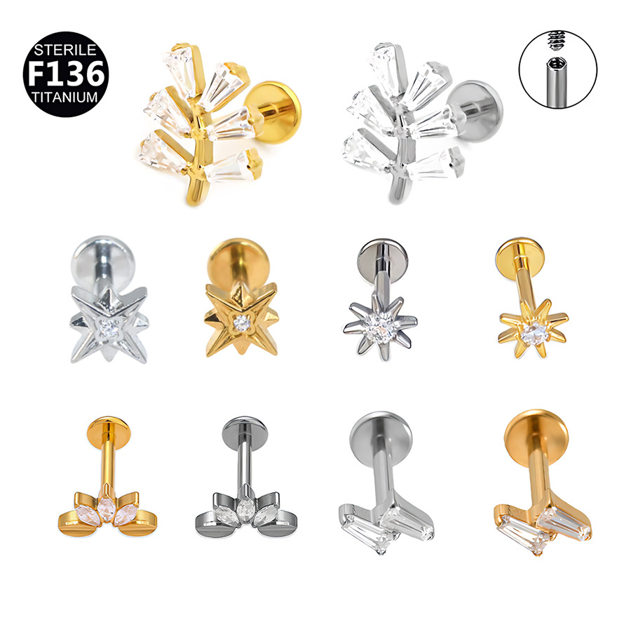 新型g23チタン内歯唇釘棒にジルコンの花の星の葉の耳の骨釘ファッション軟骨穿刺耳飾り