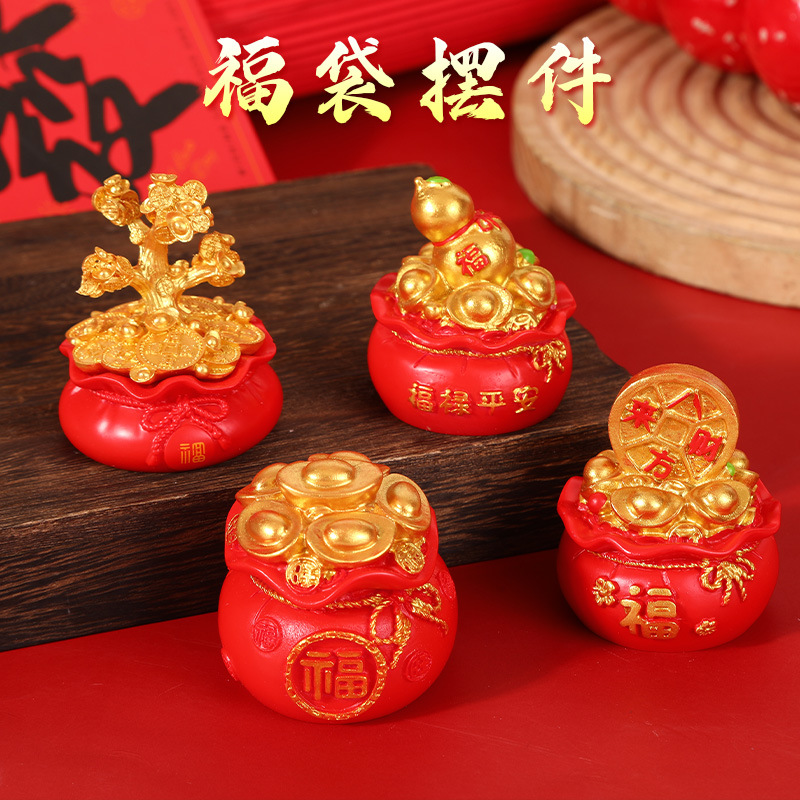 新年の旧正月の新居の喬迁の喜置物の赤い福袋のお金の袋の旧正月の雰囲気は置物を飾ります。