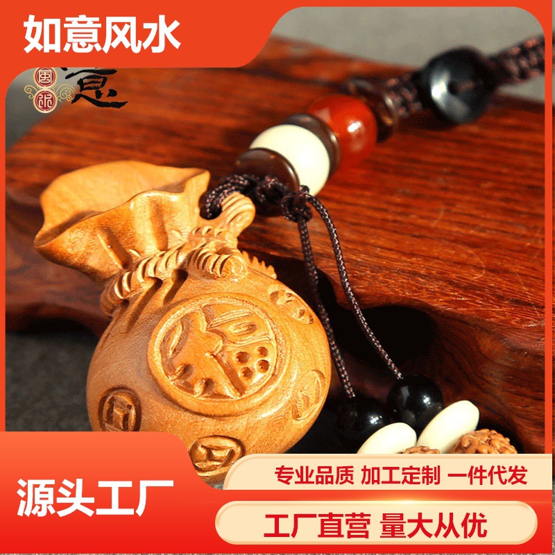本物の桃の木の彫刻のお金の袋の福袋のキーホルダーの木の彫刻の自動車の掛け物の男女は携帯して金銭のアクセサリを助けます。