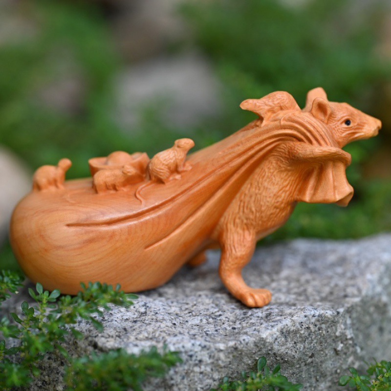 崖柏の木の彫刻のネズミのお金の袋の車の置物の生肖のネズミは代行してお金の子孫の万代の家庭のお茶のペットの工芸品を数えます。
