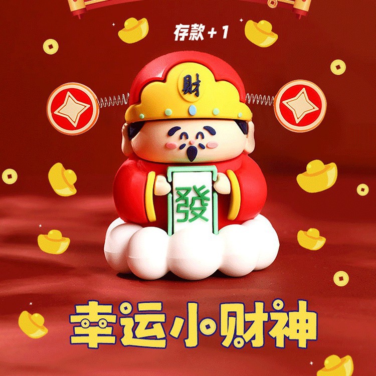 吉祥のかわいい聚宝盆の福袋は赤い火の新年のマスコットのケーキの幸運な装飾を並べます。