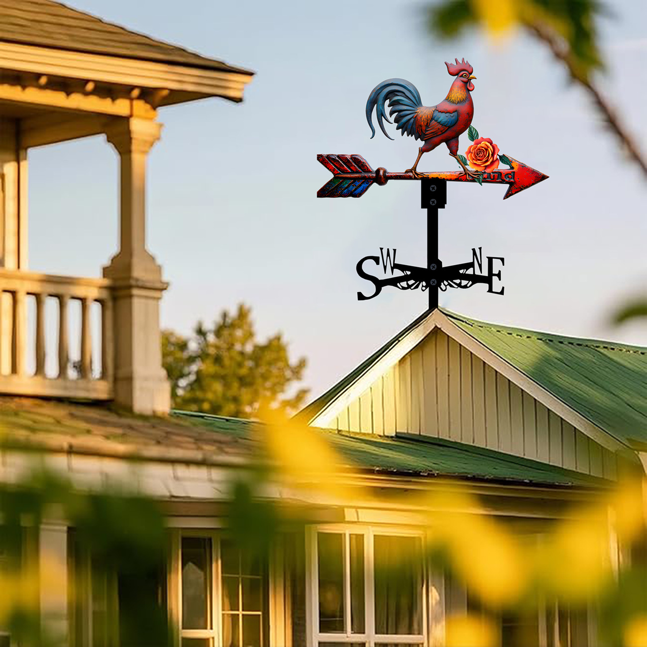 オレンジ色のバラと「風」の矢印風向計を備えた、カラフルなオンドリの形をしたクロスボーダー