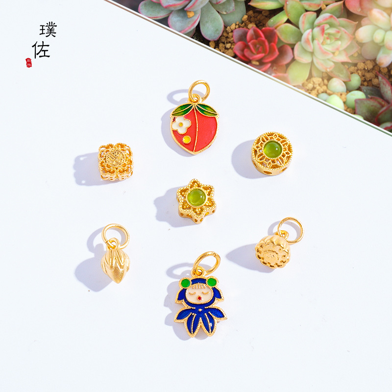 久しく色落ちしない古法沙金diy部品福字蓮蓬花蕾緑ジルコン桃金魚ペンダントビーズ