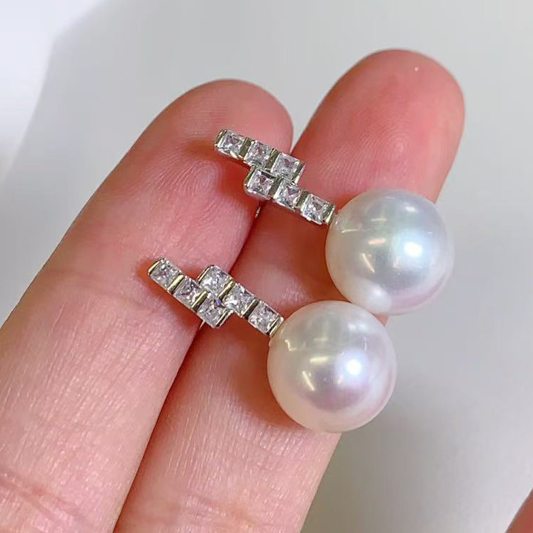 S925シルバー8-12mm淡水パールピアスアクセサリーシンプルダブルジルコンデザインラウンドヌードビーズピアス