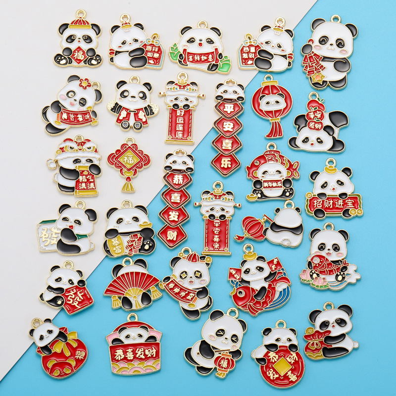 DIY 合金オイルドリップ新年中国風パンダジュエリーアクセサリーキーホルダーペンダントネックレスイヤリングペンダント W377