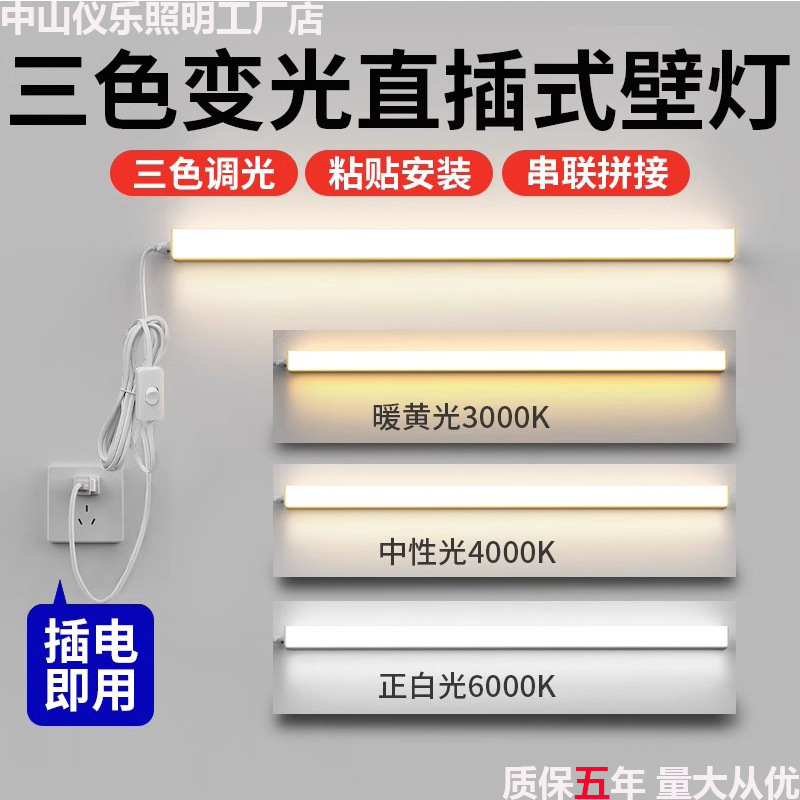 穴なし直挿式三色変光led長条灯スイッチ付き蛍光灯管寝室寮超亮照明