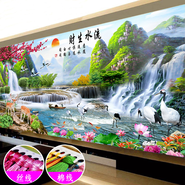 流水生財聚宝盆十字刺繍2024年新作線刺繍大幅客間宝地生財風景山水画