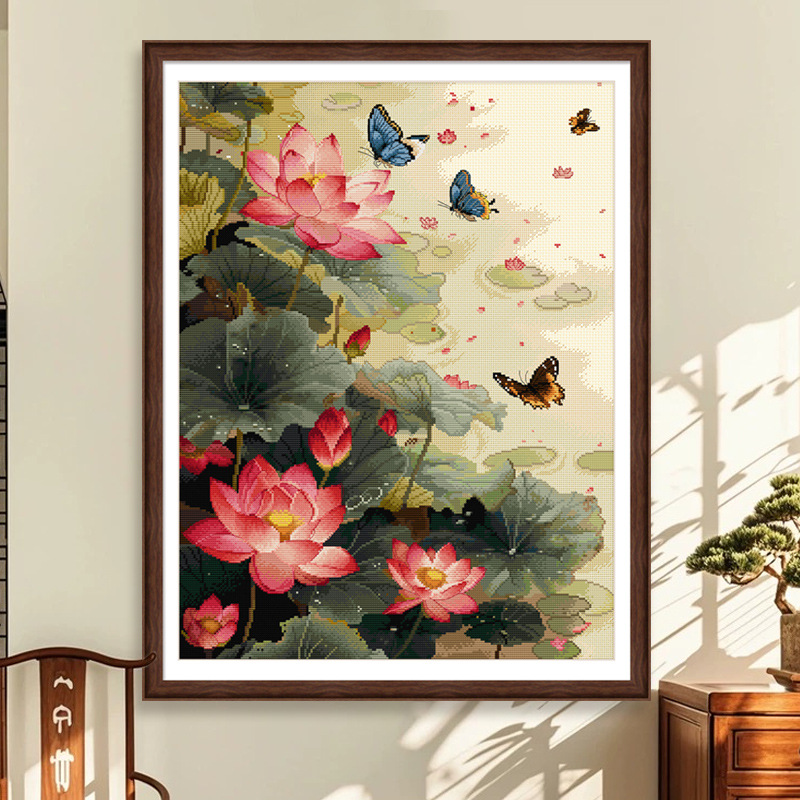 メーカー直販の代行十字刺繍の新型線刺繍縦版客間ハスの花蝶中国風手作り