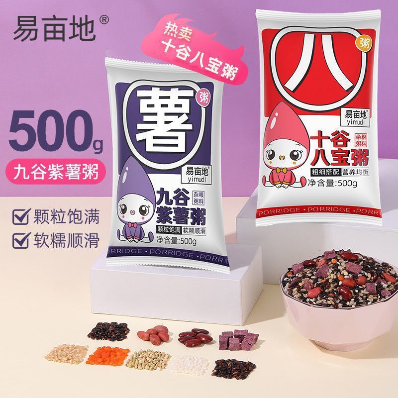 紫芋黒粥、五黒五赤気血粥、全粒朝食、全粒八宝粥の材料
