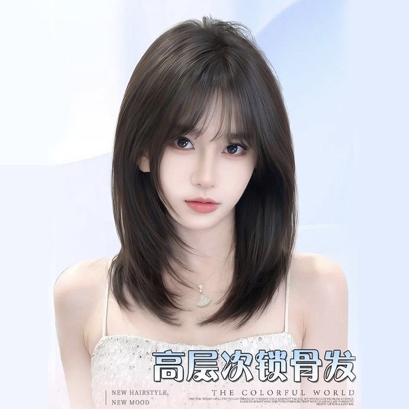 ショートヘア女性用フルヘッドギア、ミディアムロングヘア、ナチュラル人工毛、エアバング、フルヘッドギア、鎖骨年齢軽減フルヘッドギア