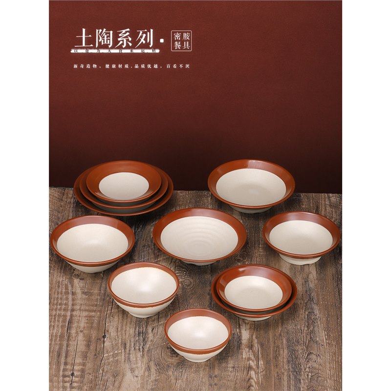 メラミンレトロな土陶食器の創意的な鍋の店は台の4セットの食事の皿の磁器の調味料の碗を並べて料理の碗を詰めて商用します。