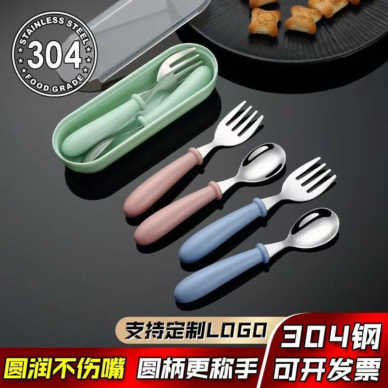 漫画304ステンレス子供カトラリーフォークスプーンボックス3点セット赤ちゃんのカトラリー母子プレゼントスプーンフォーク丸い柄