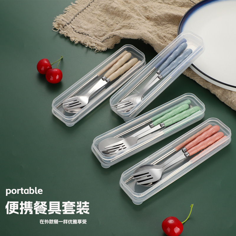 学生便利ステンレス食器スプーン箸セット竹節ハンドル三点セットアウトドア旅行西洋食器卸売り