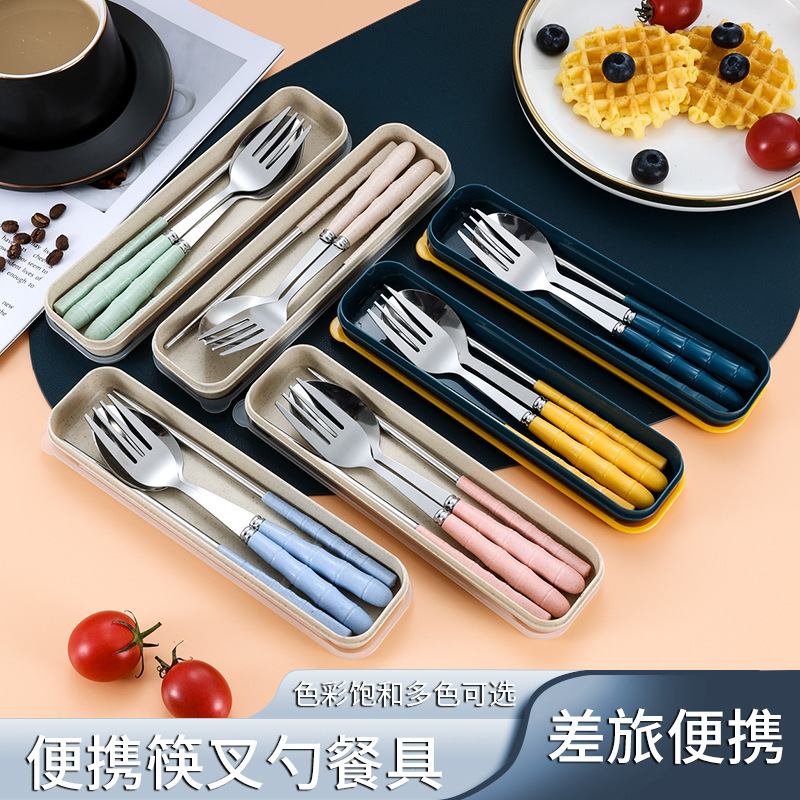 メーカー竹節ネット赤モデル小麦携帯食器セットステンレススプーン箸学生出勤ins三点セット