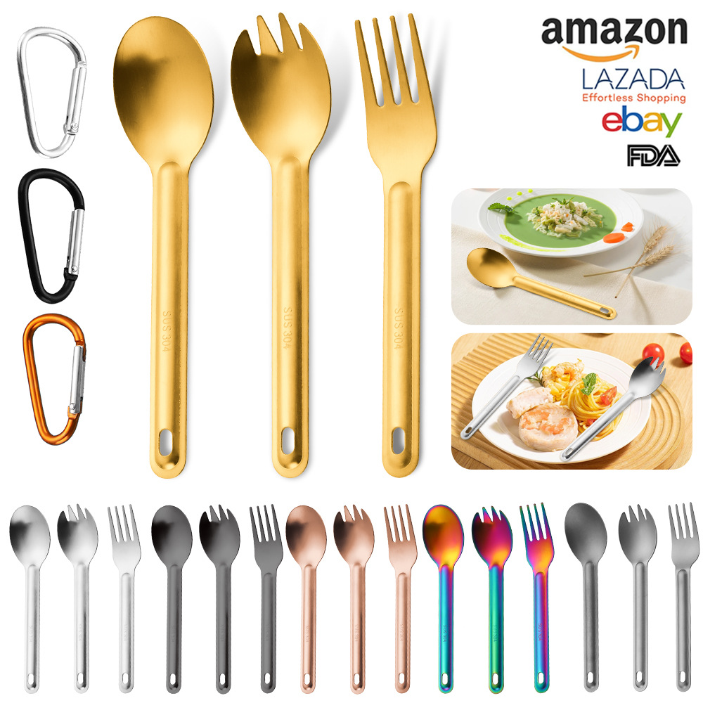 クロスボーダー 304 ステンレス鋼ロングハンドルサラダフォークとスプーン屋外ポータブル純チタン食器セットキャンプナイフとフォークスプーン