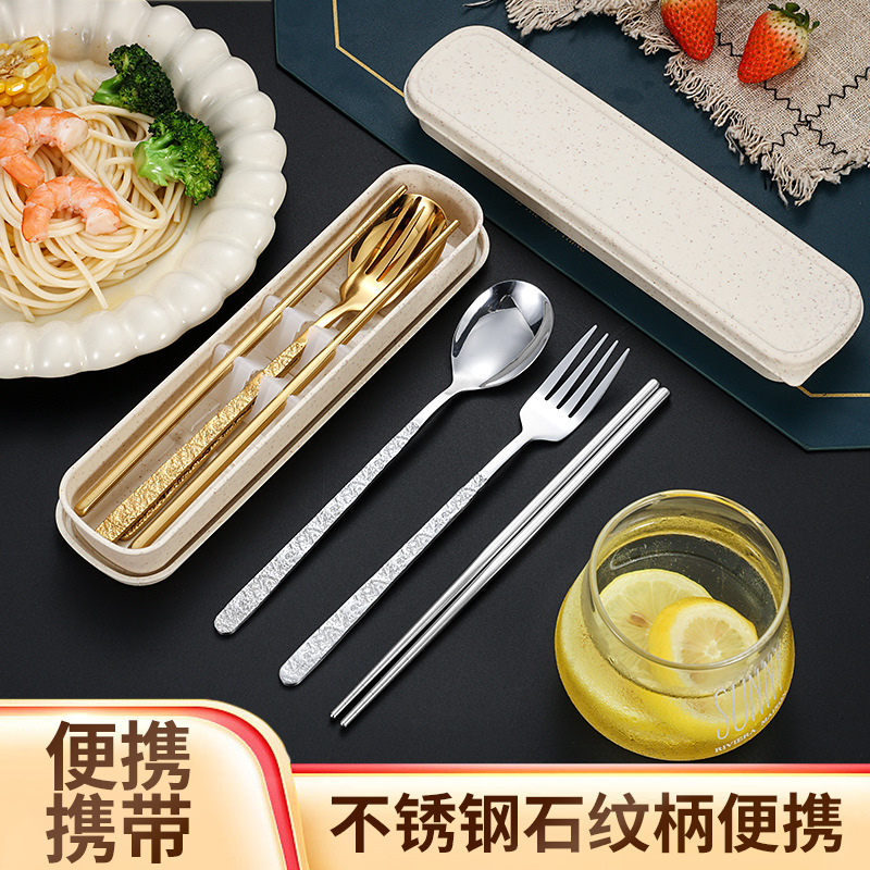 韓国式石紋携帯食器セットステンレス学生サラリーマン三点セットフォークスプーン収納ケース
