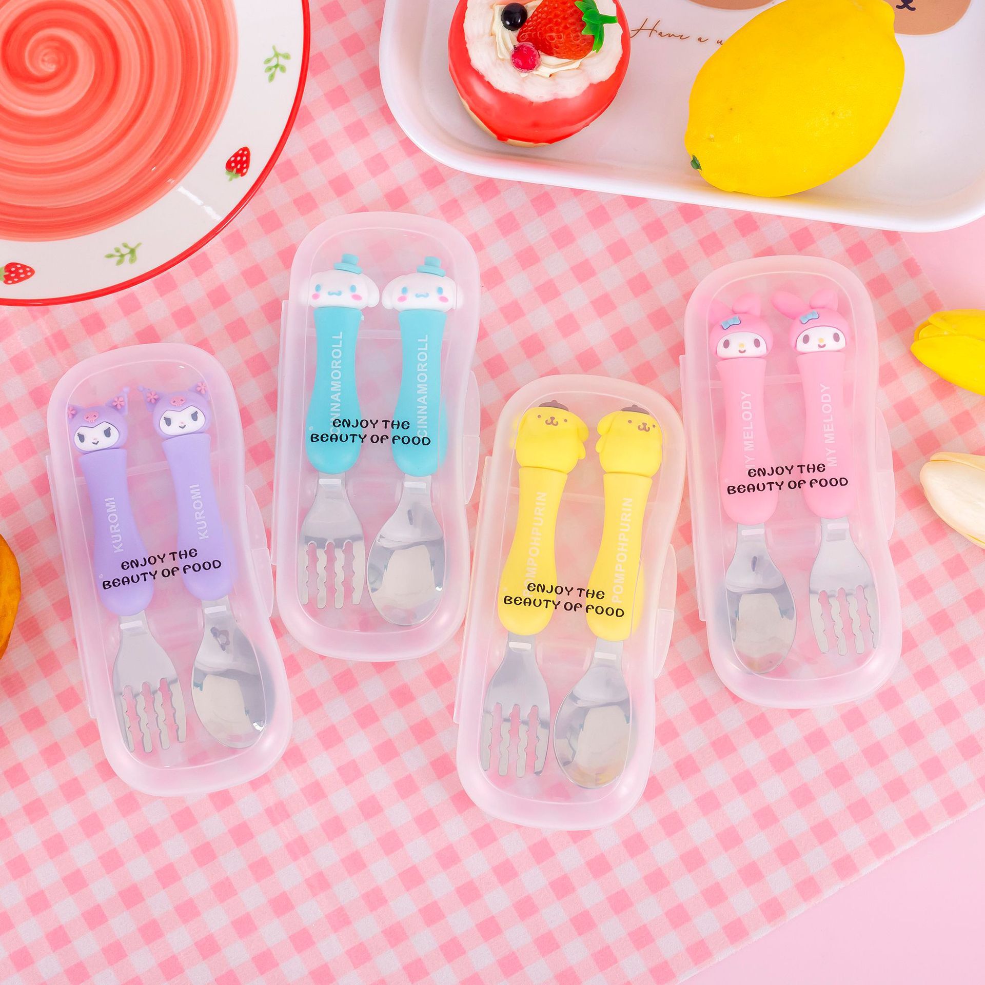 My058新型アニメ子供食器ステンレス二点セット三麗欧携帯食器箱フォークスプーンセット