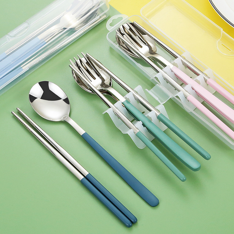 ポータブル箸スプーンフォークのセット三点セット学生ステンレス食器箱付き一点セットギフト