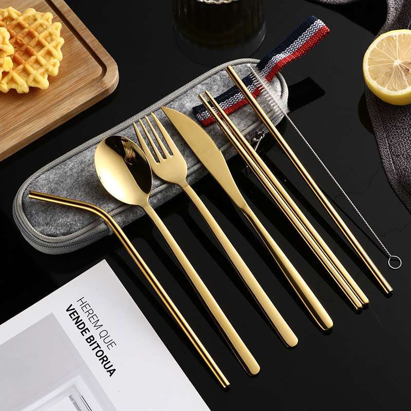 国境を越えてアマゾンのステンレス食器を提供する携帯型屋外旅行ナイフフォークスプーン箸ストロー7点セット