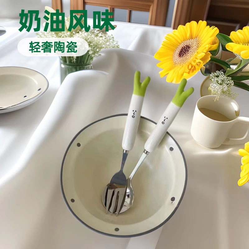 304ステンレス製セラミックフォークスプーン携帯食器セット大葱スプーンフォーク家庭用食事スプーンins風携帯用