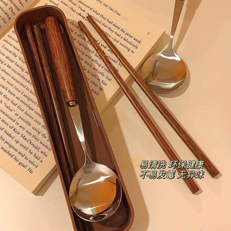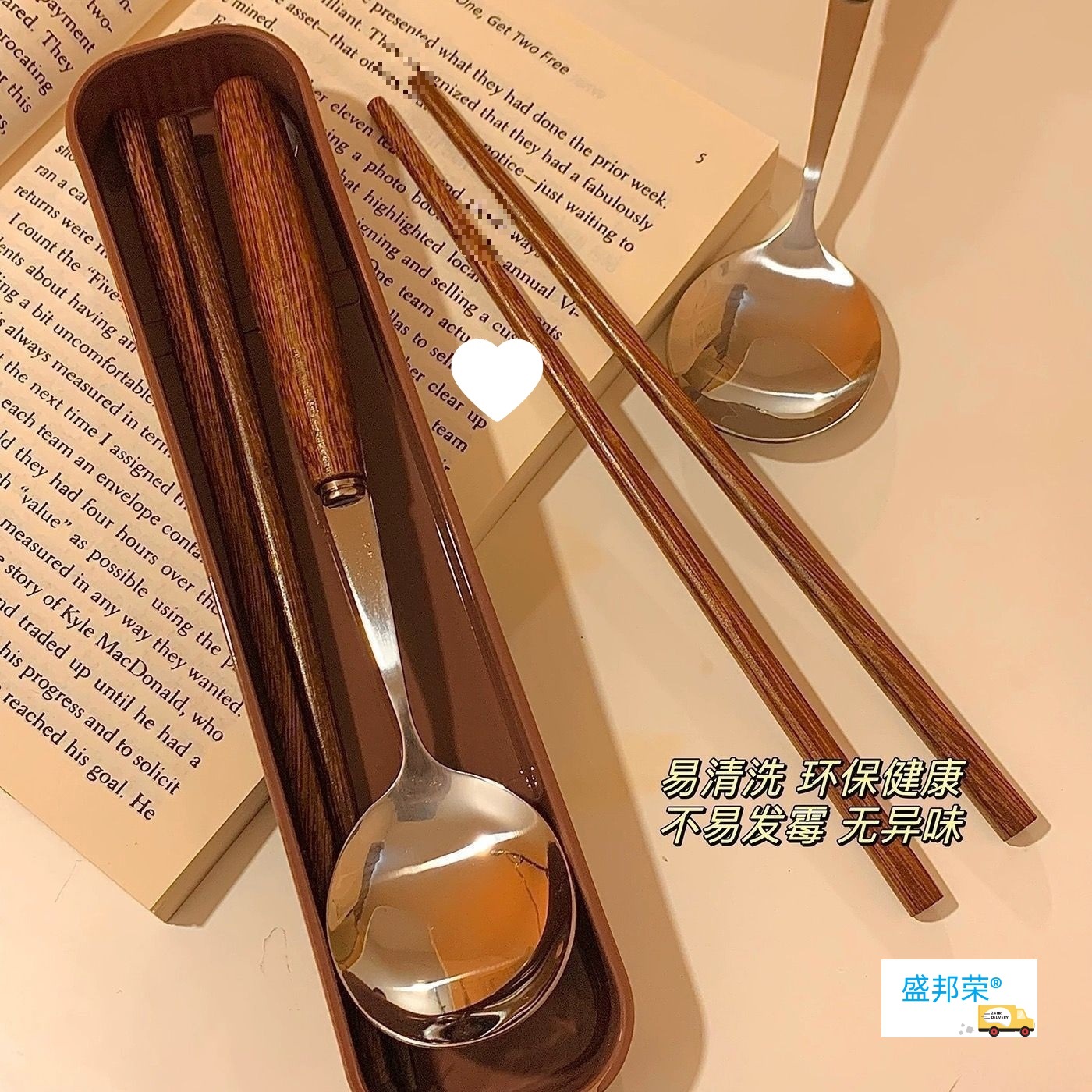 キャラメルカラーのウェンジウッド! 円筒形の木製ハンドルの箸とスプーン、学生向けのポータブル食器セット