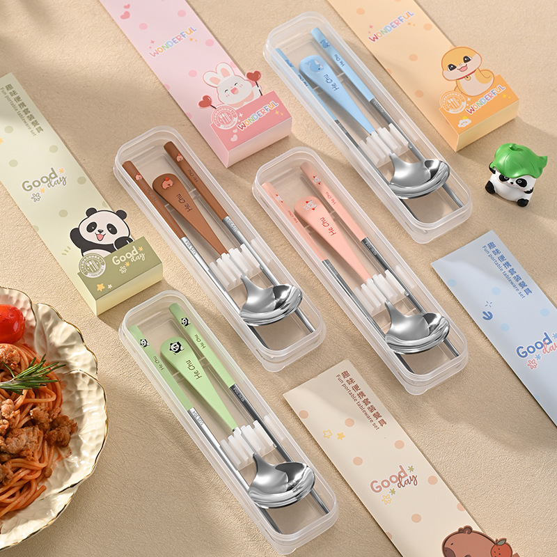 304 ステンレス鋼のスプーン、フォーク、箸、食器 3 点セット漫画かわいい屋外学生ポータブル食器セット