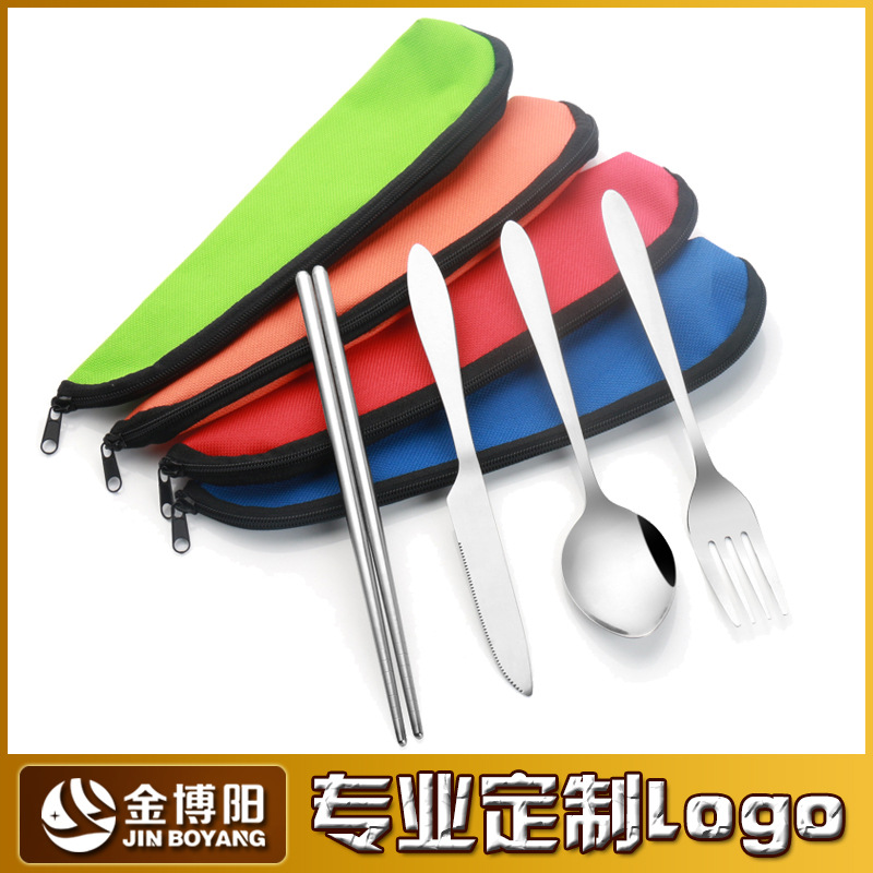 ステンレス携帯式食器セットナイフフォークスプーン箸袋食器三点セット学生用食器箱印logo