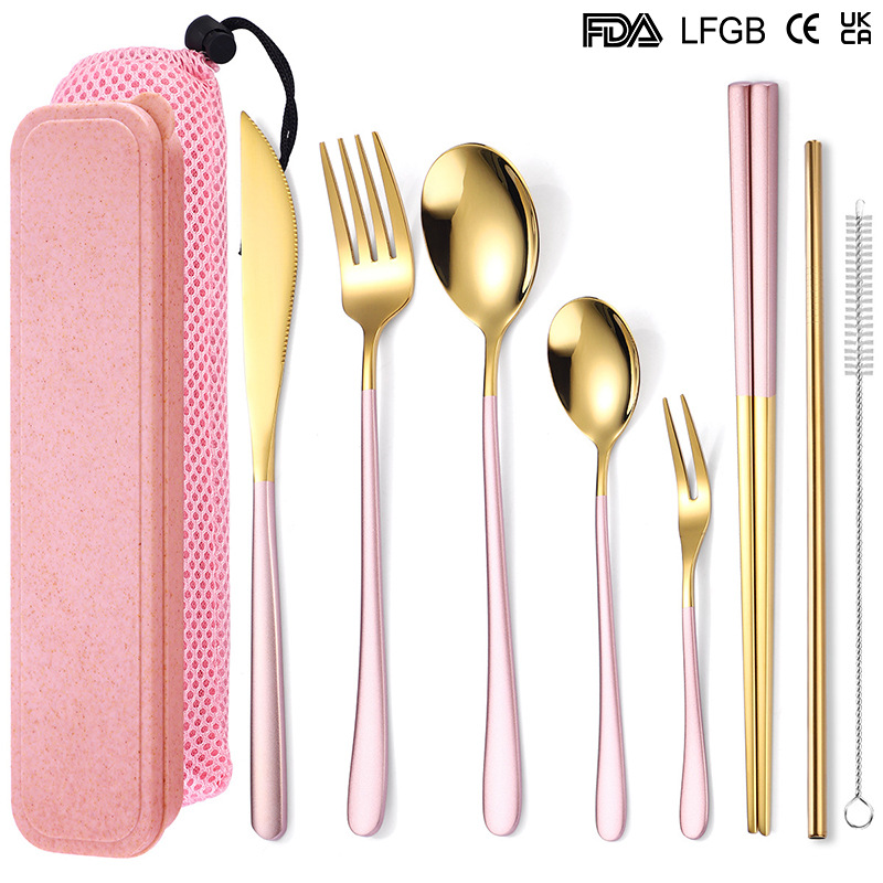 304ステンレス韓国式携帯食器8点セットナイフフォークスプーン箸ストロー学生家庭用セット長柄