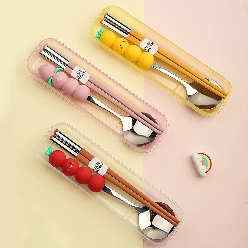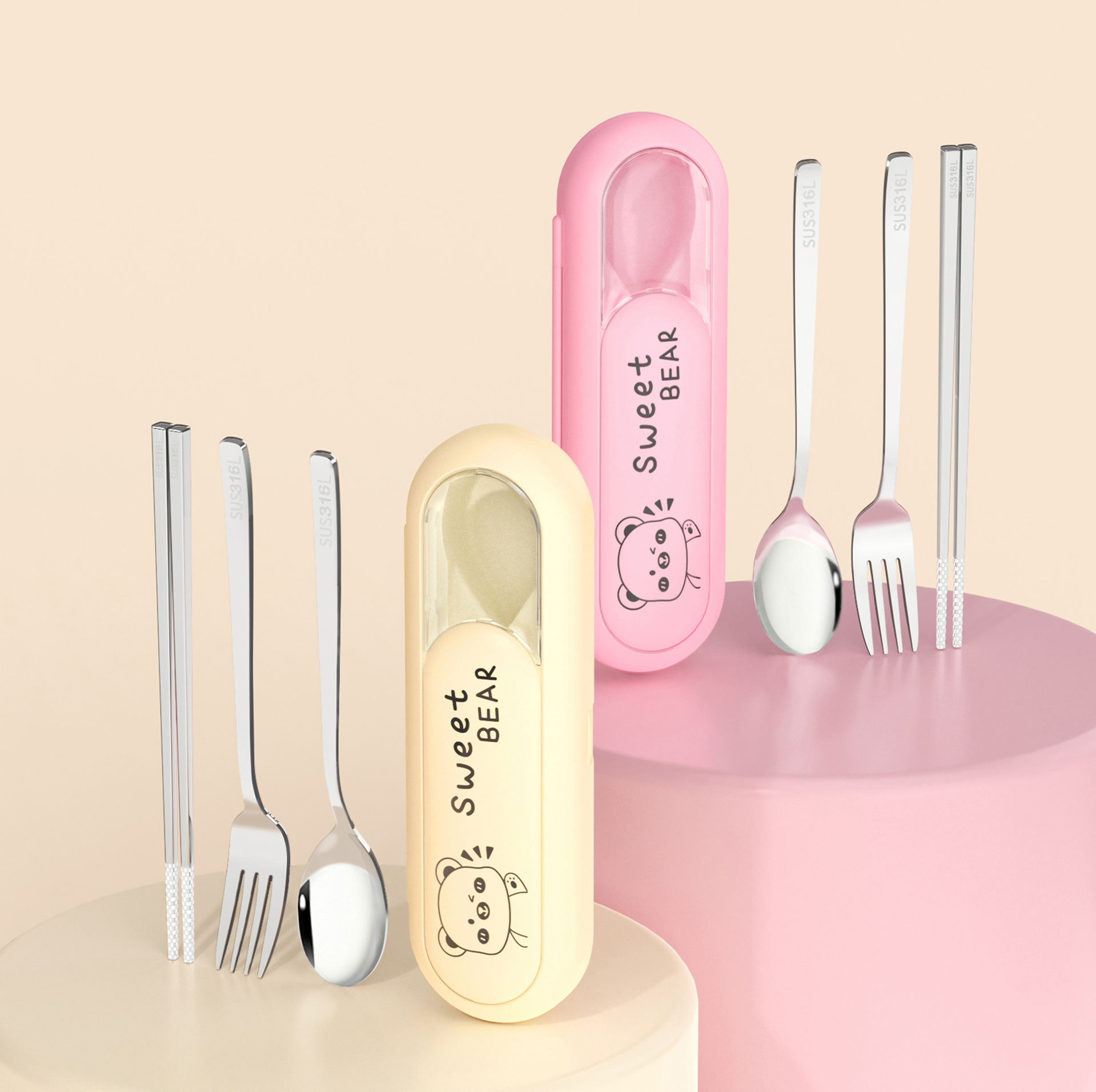 R ^ ポータブル食器ケース可爱い三点セット学童箸スプーンセットステンレス外付け可収纳