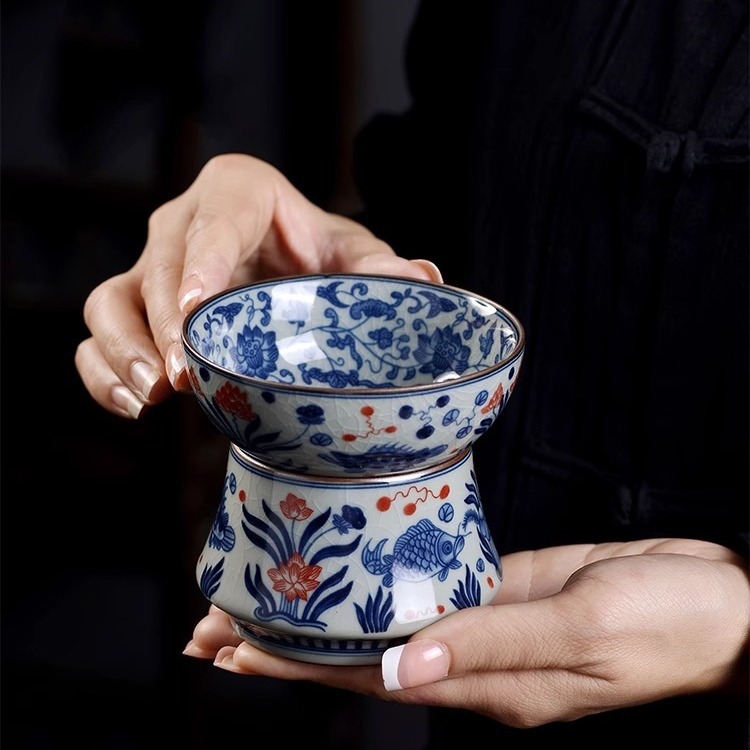 景徳鎮の青花の古い陶泥の魚の風呂の紋様のお茶は陶磁器のお茶を漏らして家庭のお茶を濾過して一体の復古の濾過ネットを隔てて開けます。