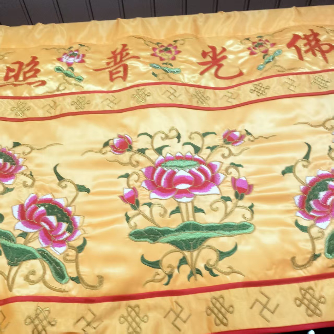 メーカー卸売サテン生地仏殿装飾刺繍テーブルカバー蓮テーブルカバーテーブルスカート
